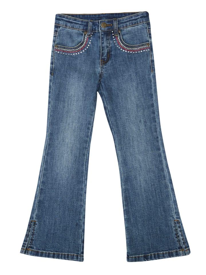 Длинные джинсы для девочек, средне-синего цвета, расклешенные, с разрезами по бокам. Пять карманов. Эластичный пояс с регулируемой внутренней резинкой. Состав: 98% хлопок, 2% эластан.