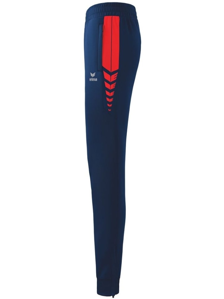 Прочная ткань; Широкий эластичный пояс со шнурком; Боковые карманы на молнии; Широкие манжеты в рубчик на штанинах; Молнии на штанинах; Зауженный крой; Конструкция ERIMA Swing в верхней части боковин.