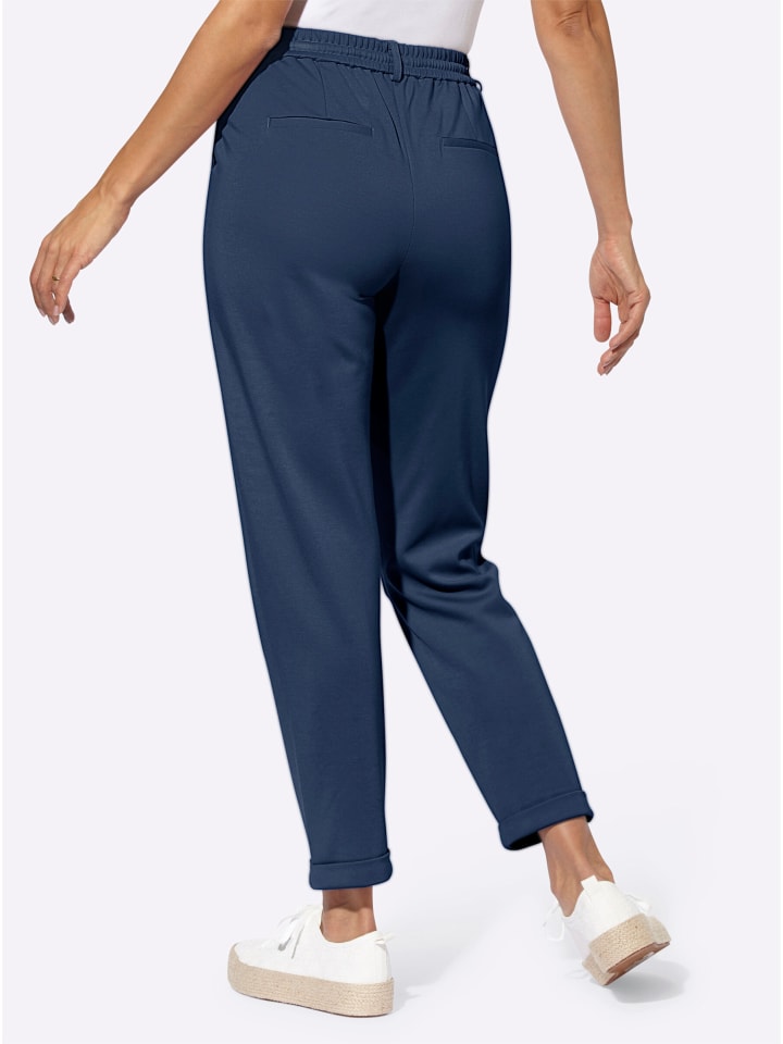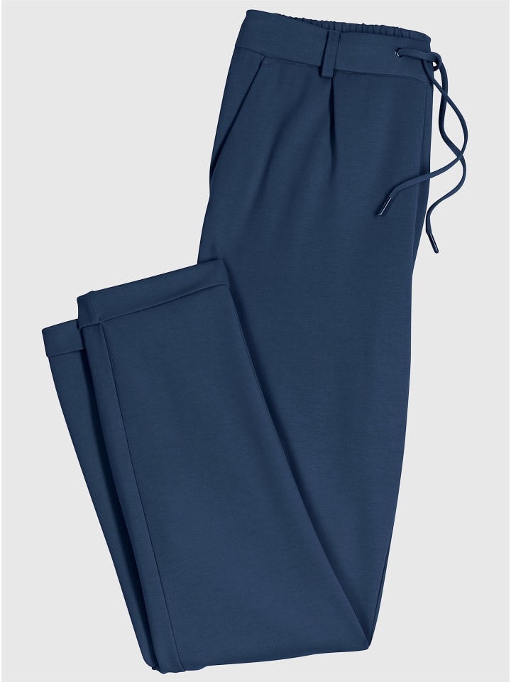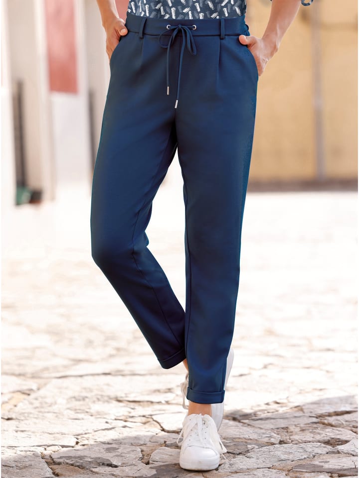 Эти брюки-джоггеры - повседневные и удобные, но в то же время стильные и универсальные - изготовлены из мягкой, сохраняющей форму ткани интерлок, которая не мнется. Они легко надеваются, имеют эластичный пояс с гладкой частью и кулиской спереди, а также шлевки для ремня. Складки спереди и вытачки сзади обеспечивают идеальную посадку. Два передних кармана и имитация прорезных карманов сзади. Длина брючины до щиколотки с фиксированной манжетой. Изготовлены из вискозы Lenzing ECOVERO. Ширина брючины: около 32 см. Без пояса.
