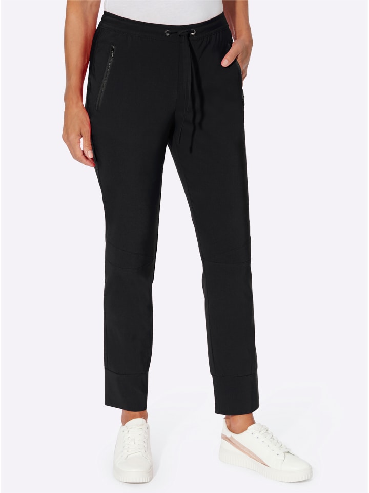 Для вашего энергичного образа: брюки-стринги из высокоэластичной ткани Bengaline в модном стиле Jogger. Эластичный пояс с гладкой зоной живота. Дополнительная кулиска спереди. Идеальная посадка благодаря кокетке сзади. Два кармана на молнии спереди, два кармана сзади. Непринужденный вид дополняют швы на уровне колена и широкие манжеты внизу брючин. Длина брючины примерно 32 см.