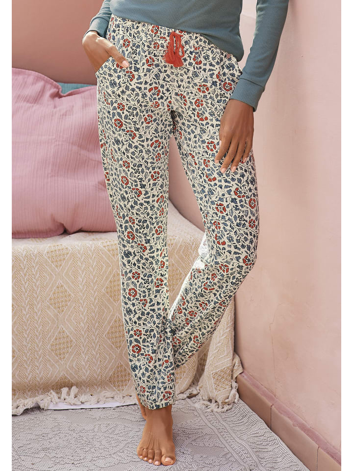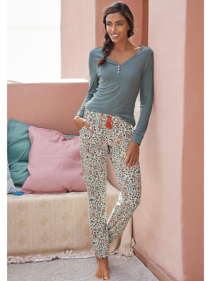 Пижамные штаны с принтом от Lascana. С эластичными манжетами и талией на шнурке с кисточками. С боковыми карманами. Состав: 60% полиэстер, 36% вискоза, 4% эластан