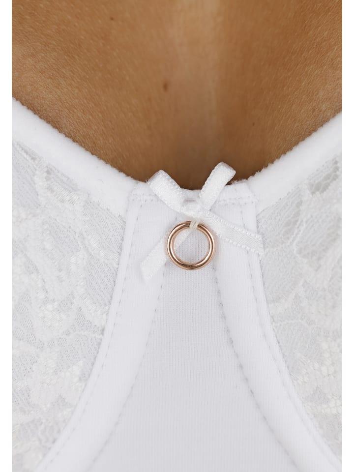Женственный минимайзер на косточках - визуально уменьшает грудь. Высокий комфорт при ношении благодаря дышащим, сверхлегким чашкам-спейсерам. С красивыми кружевными бретельками. С нежным декоративным бантом и аксессуаром спереди по центру. Бретельки и застежка на спине регулируются индивидуально. Состав: 78% полиамида, 18% эластана, 4% полиэстера.