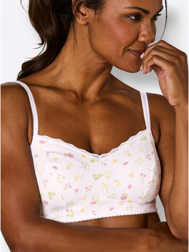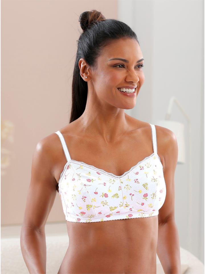 Бюстгальтер без косточек от Wäschepur с двухсекционными чашками, выполненный в модном принте. Изящная деталь: узкая окантовка по вырезу. Эластичные бретели регулируются сзади. Соответствует инициативе «Хлопок, сделанный в Африке».