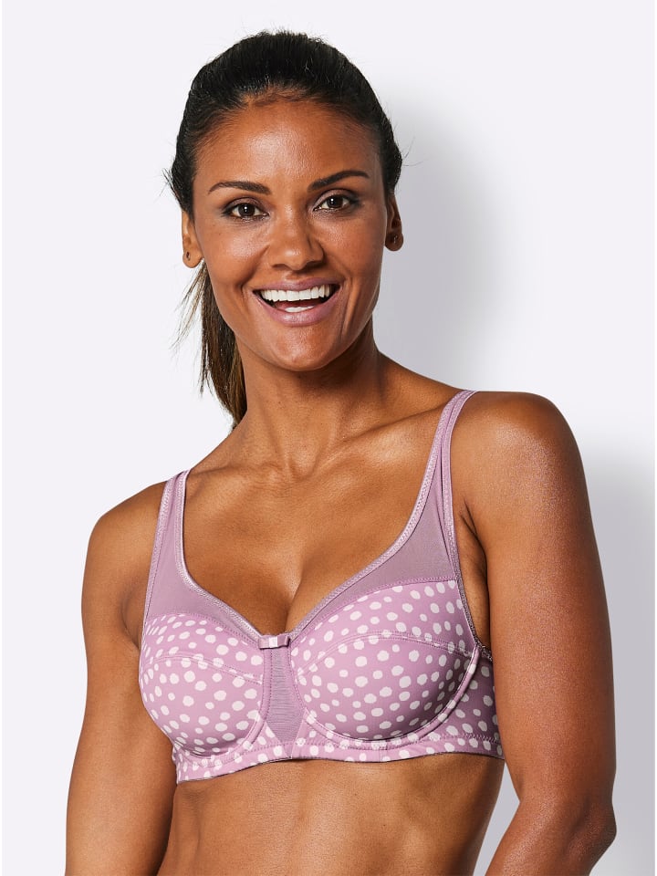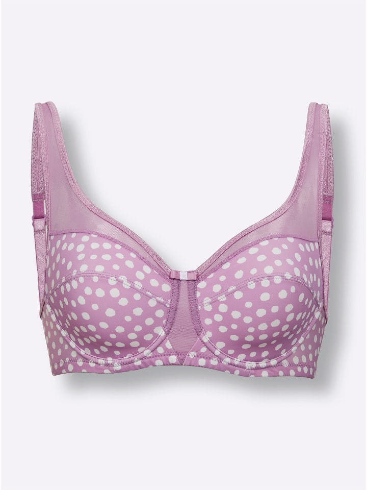 Бюстгальтер на косточках от Wäschepur. Изящная деталь: слегка прозрачная сетчатая вставка спереди, которая переходит в регулируемые бретельки сзади! Чашечки, состоящие из двух частей, украшены игривым принтом в горошек.