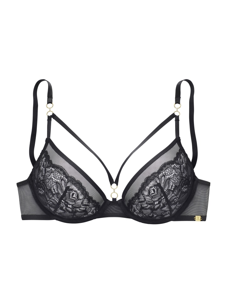 Соблазнительный бюстгальтер на косточках с восхитительными деталями в виде колец и лент. Чашечки из тонкого плоского жаккардового кружева. Спинка из слегка прозрачной сетки. Бретельки и застежка на спине регулируются индивидуально. Дизайнер: Джетт Йооп. Изготовлен из 90% полиамида, 10% эластана.