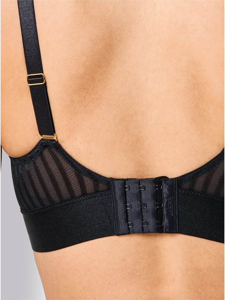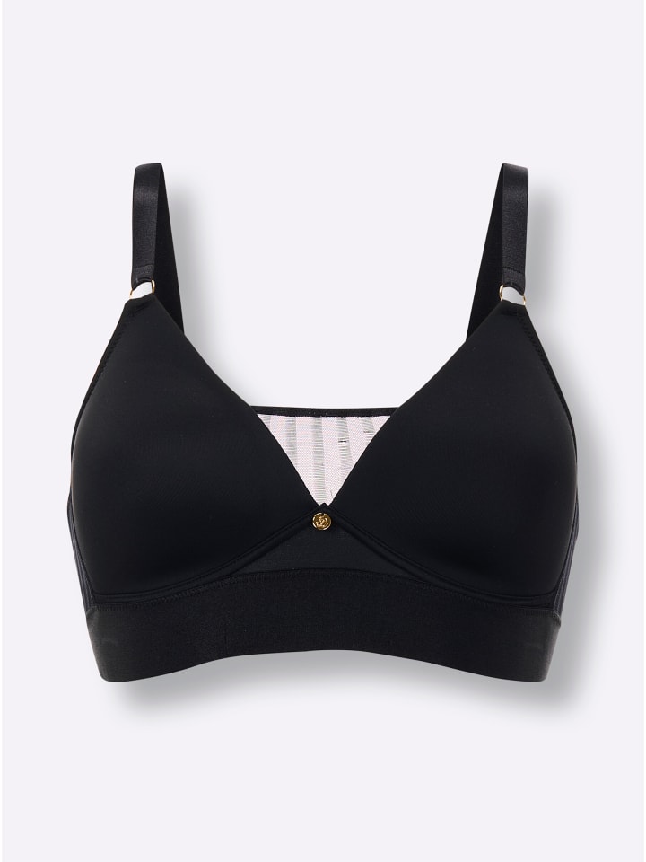 В стиле Jasper: бюстгальтер-майка без косточек от Wäschepur. Мягкие чашечки с декоративными сетчатыми вставками. Регулируемые блестящие бретели сзади и широкая блестящая лента под грудью.