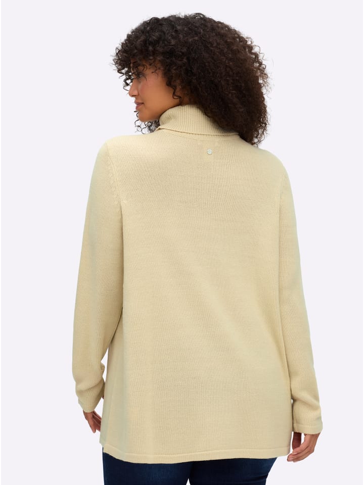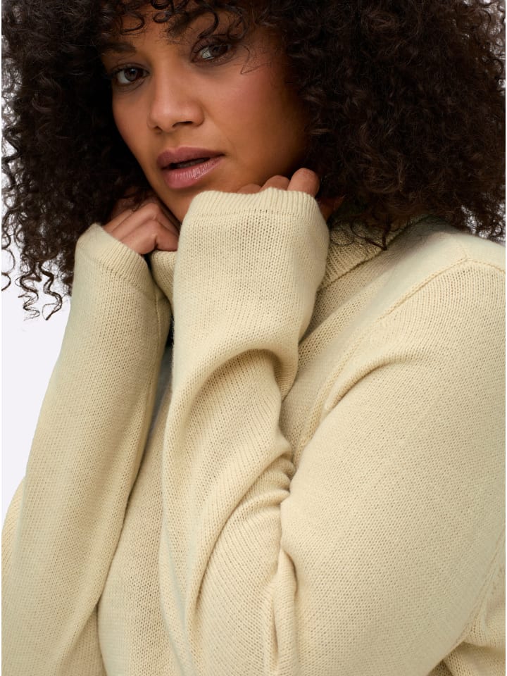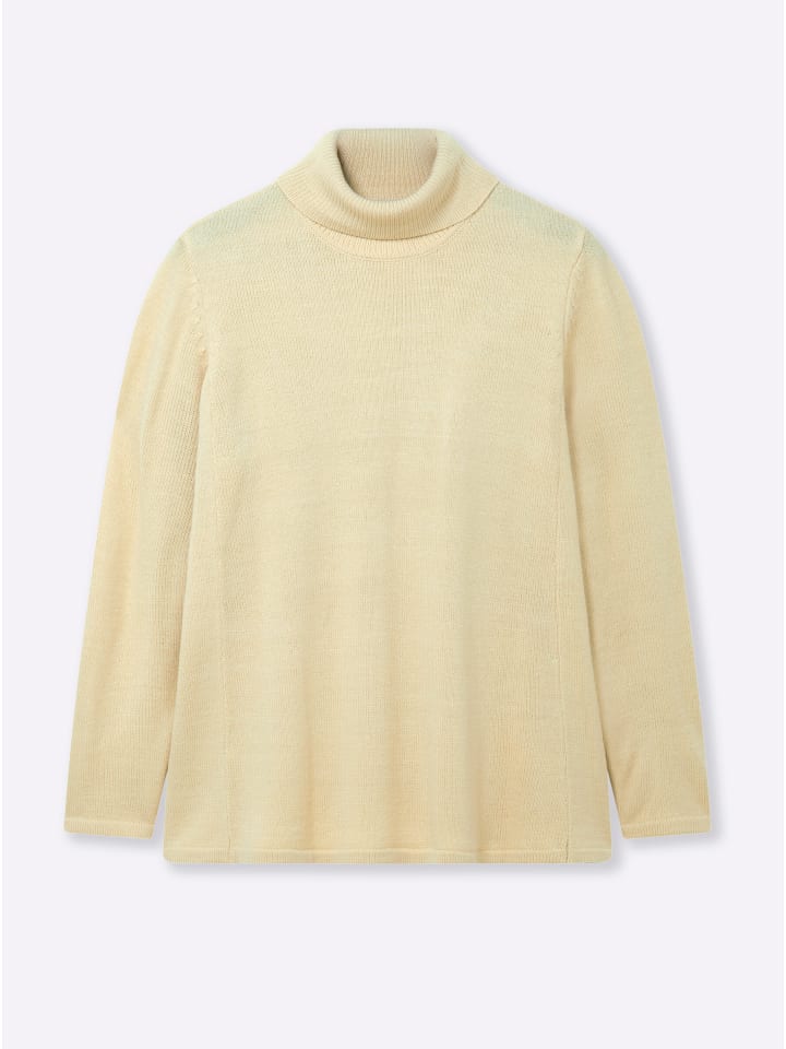 Свитер с ребристым воротником-стойкой. Боковые вставки придают свитеру дополнительную ширину и подчеркивают фигуру.