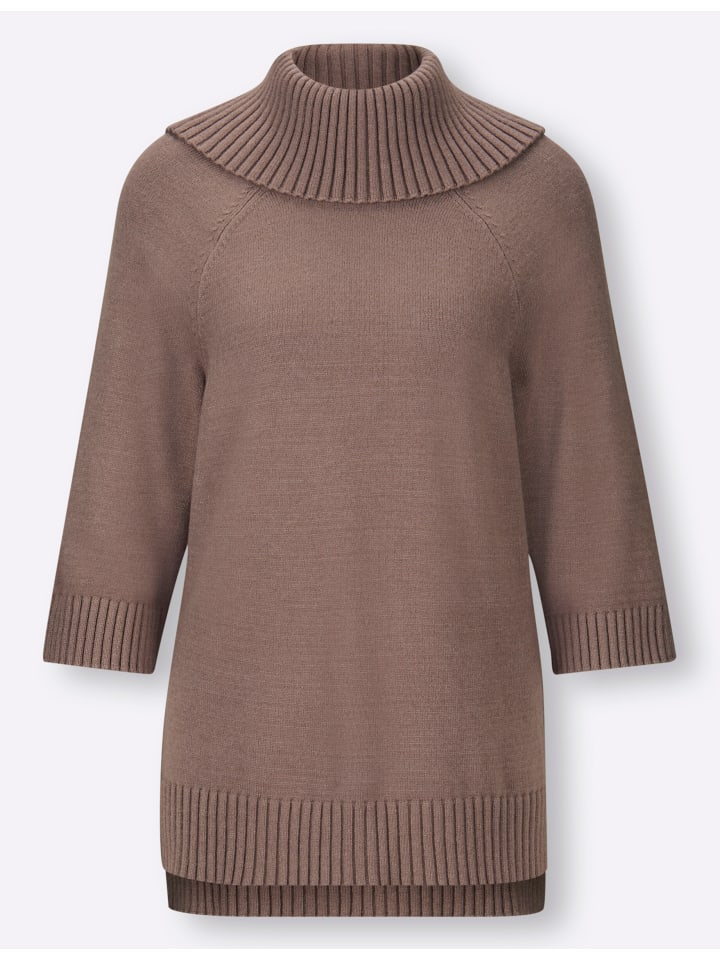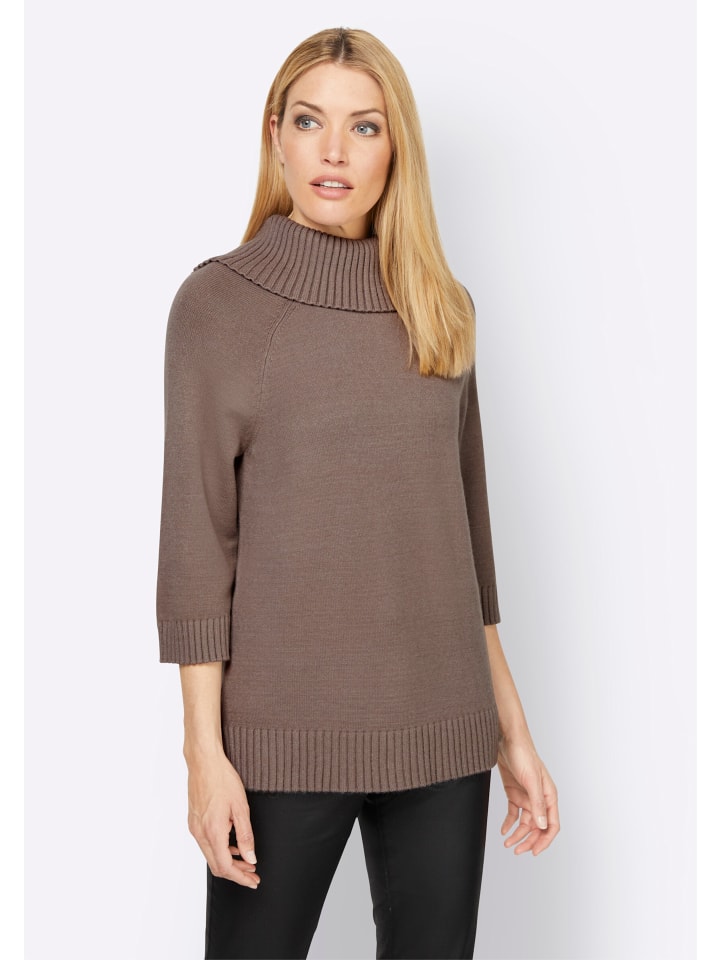 Стильный свитер тонкой вязки с высоким воротом - слегка удлиненный сзади. Прямой крой. Современный ребристый ворот, отходящий от шеи. Небольшие разрезы по бокам. Рукава 3/4 с ребристыми манжетами и нижним краем.