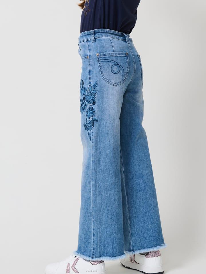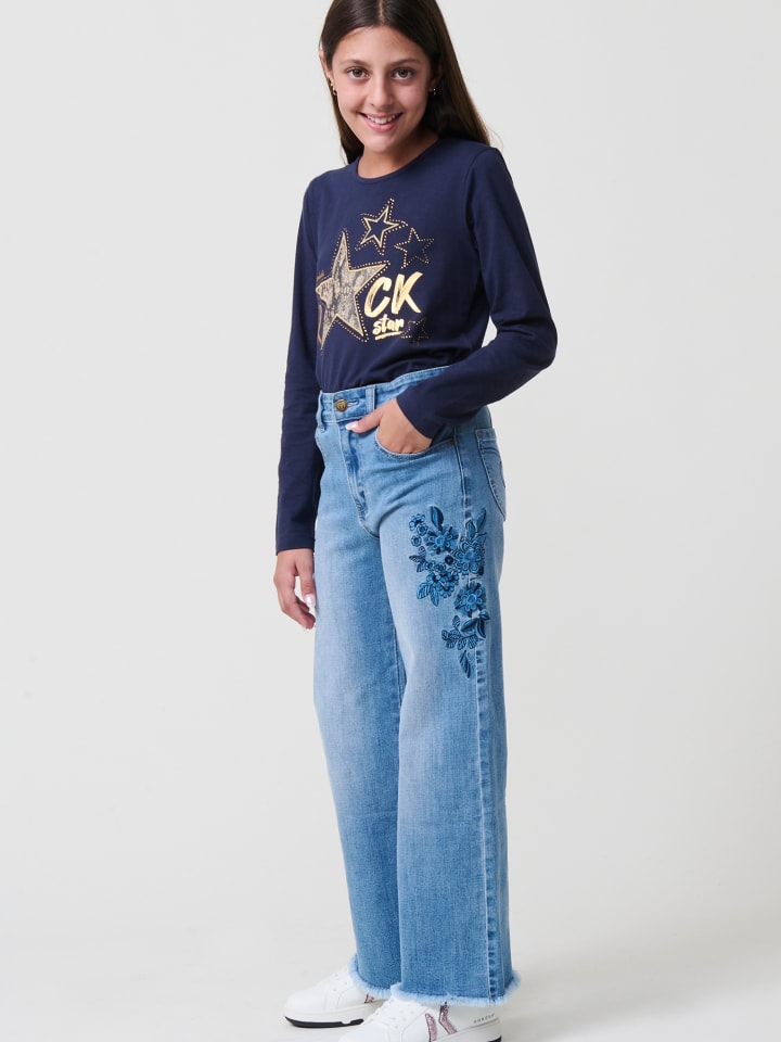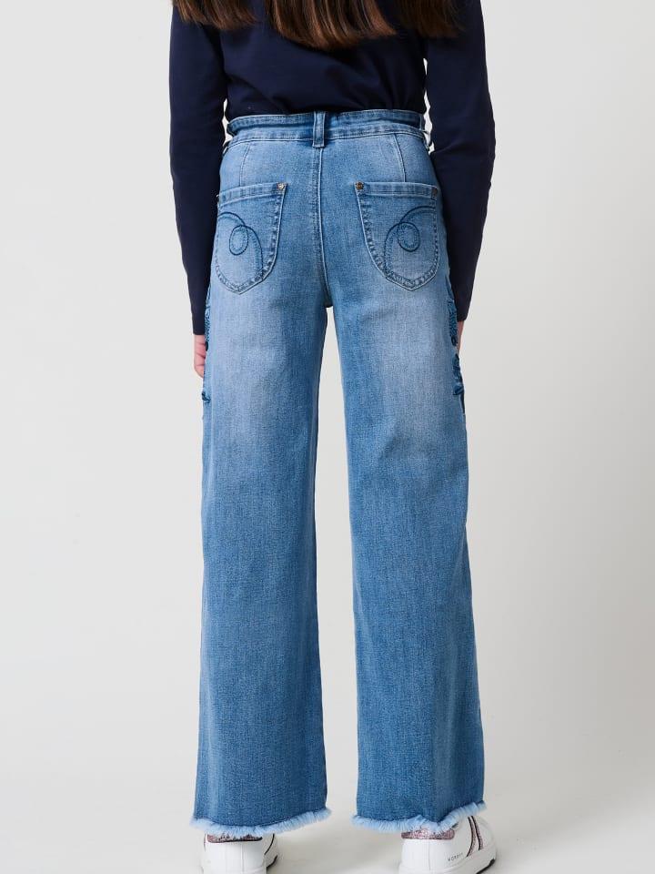 Длинные брюки для девочек среднего синего цвета из эластичного денима, со свободным кроем и необработанными краями. Пять карманов. Эластичный пояс с внутренней регулировкой. Состав: 98% хлопок, 2% эластан.