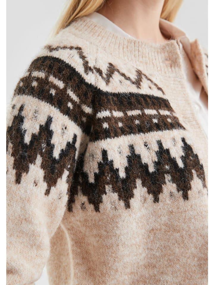 Этот уютный кардиган с традиционным норвежским узором станет вашим идеальным зимним спутником. Мягкая смесь полиэстера и классический классический крой обеспечат максимальный комфорт - идеальный вариант для расслабленных дней и стильных повседневных образов.