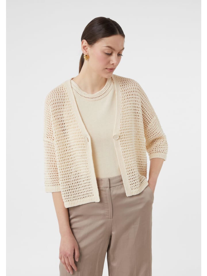 Воздушная роскошь и современный дизайн: этот кардиган свободного кроя очаровывает своим ажурным узором. V-образный вырез и спущенная линия плеч создают непринужденный силуэт. Изготовленный из высококачественной хлопковой смеси, он обеспечивает исключительный комфорт. Сочетайте его с простым топом и узкими джинсами для создания непринужденного образа или с летним платьем для создания элегантного образа.