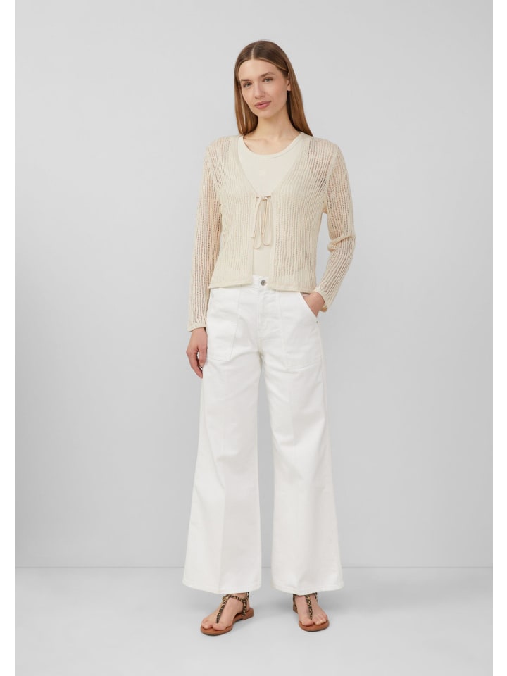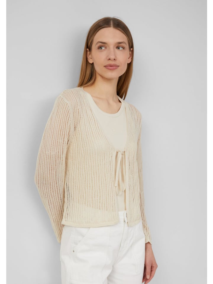Этот воздушный кардиган из смесовой льняной ткани сочетает в себе комфорт и женственную элегантность. Нежный ажурный узор и V-образный вырез добавляют модные акценты, а завязка обеспечивает гибкие возможности для создания стильного образа в расслабленные летние дни.