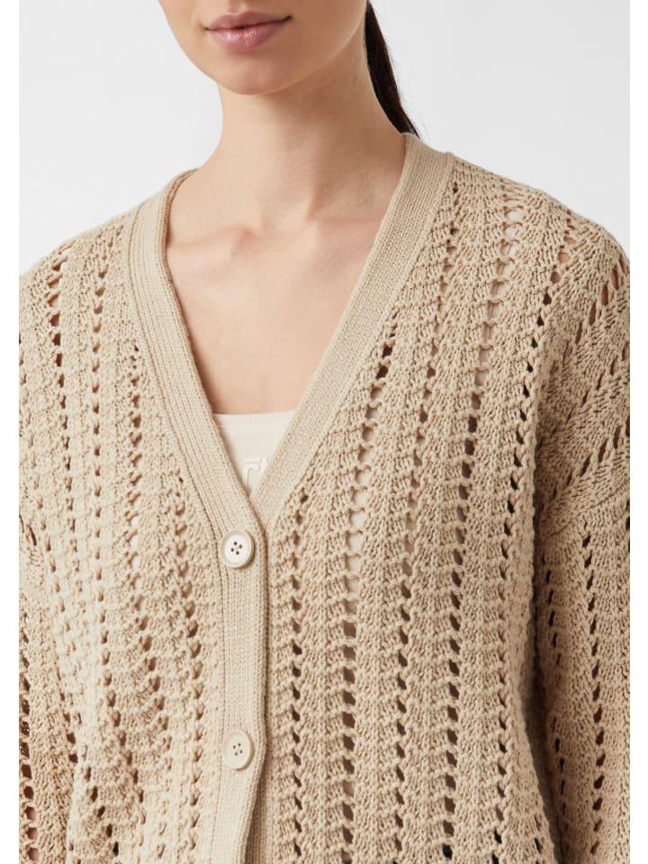 Структурированный шик для прохладных дней: этот кардиган из смесовой хлопковой ткани сочетает в себе комфорт и стиль. Ажурный узор придает вязаному изделию изысканность, а V-образный вырез и планка на пуговицах добавляют женственных акцентов. Спущенная линия плеч и свободный крой создают непринужденный силуэт. Сочетайте его с простым топом для создания элегантного многослойного образа.