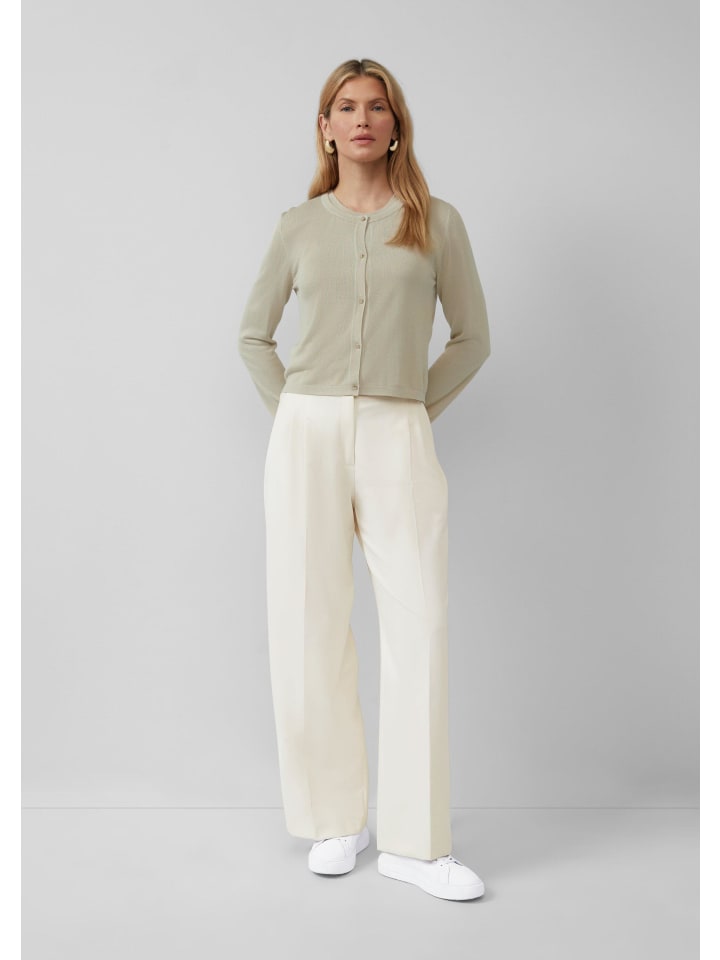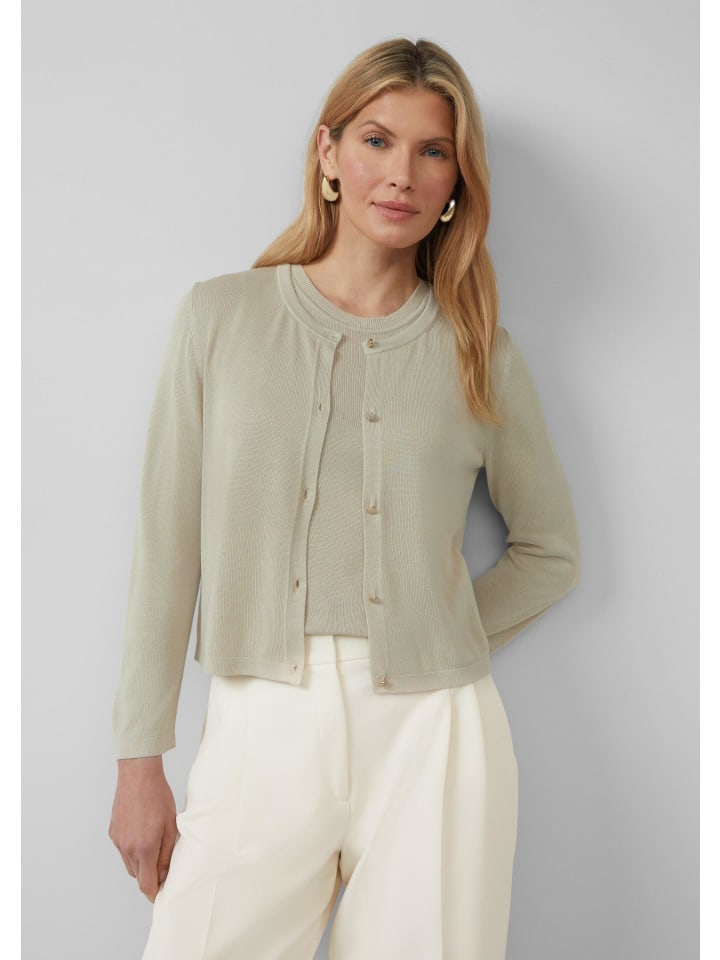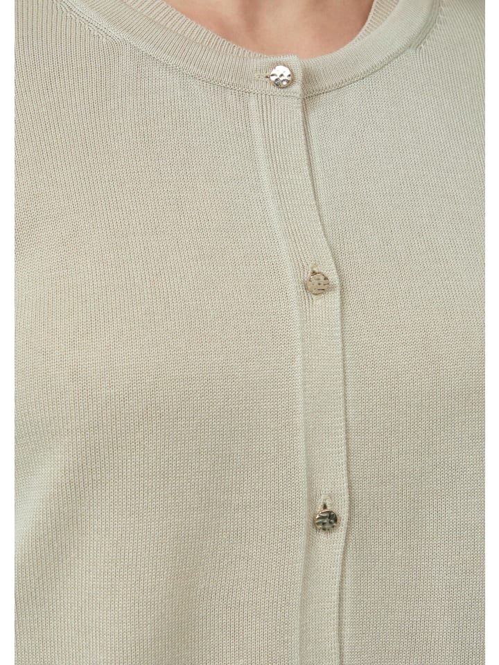 Ваш идеальный спутник на все случаи жизни: этот приталенный кардиган с рукавами 3/4 сочетает в себе элегантность и комфорт. Мягкая, тонкая вискозная ткань приятно ощущается на коже и имеет легкий блеск. Круглый вырез горловины и элегантные декоративные пуговицы добавят стильный штрих - как в офис, так и на ужин.