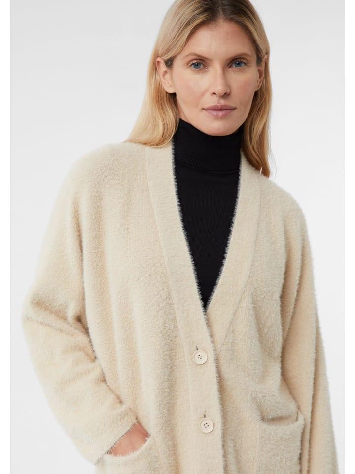 Откройте для себя истинный комфорт в этом уютном кардигане свободного кроя. Мягкая, тонкая вязка с слегка ворсистой текстурой приятно ласкает кожу и обеспечивает комфортную эластичность для максимального комфорта. Женственный V-образный вырез, спущенная линия плеча и ребристые манжеты по подолу придают этому кардигану с длинными рукавами непринужденный силуэт. Благодаря практичной застежке на пуговицы этот легкий кардиган можно носить по-разному - идеально подходит для создания многослойного образа в прохладные дни или как непринужденный акцентный предмет одежды для уютных моментов.