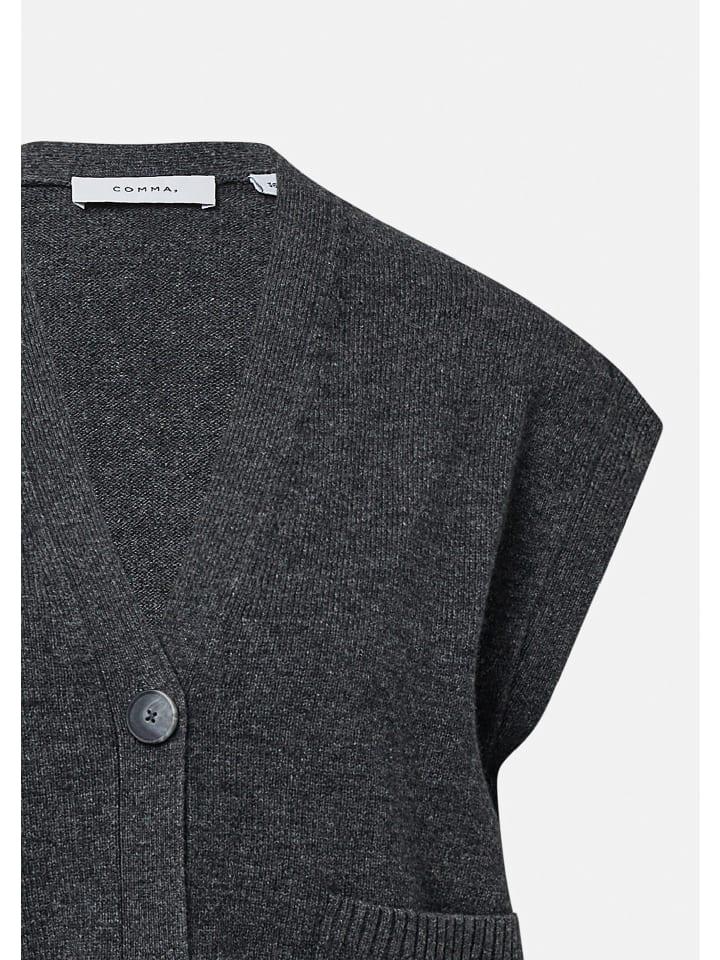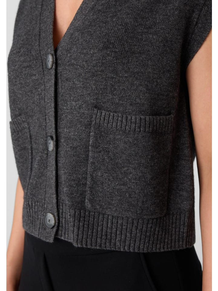 Стильный и комфортный: этот высококачественный трикотажный жилет из смесовой шерсти сочетает в себе элегантность и функциональность. V-образный вырез и накладные карманы создают современный силуэт при стандартном крое. Эластичная тонкая вязка и ребристый подол гарантируют максимальный комфорт. Застежки на пуговицы добавляют изысканности. Его можно носить по-разному - от делового образа до повседневного образа для выходного дня.