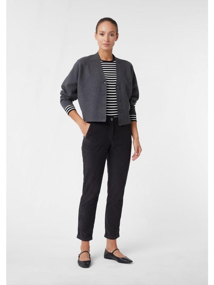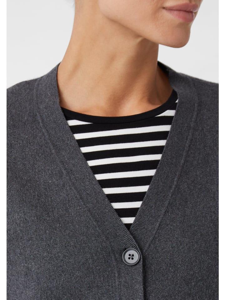 Откройте для себя идеальное сочетание комфорта и стиля в нашем укороченном кардигане из смесовой вискозы. V-образный вырез и спущенная линия плеча придают вашему образу непринужденную элегантность. Благодаря мягкой и эластичной тонкой вязке он обеспечивает комфортное ощущение на коже. Ребристые манжеты и застежка на пуговицы дополняют дизайн. Универсальный must-have для ваших нарядов.