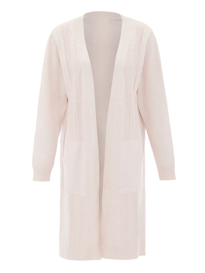 Украсьте свой гардероб этим элегантным кардиганом длиной до колена. Ребристая текстура на манжетах и подоле, а также изысканная отделка косичками спереди создают изысканный образ. Свободный крой и прямой силуэт обеспечивают стиль и комфорт, а встроенные карманы добавляют функциональности этому уютному изделию. Разработанный совместно с ALARY, этот кардиган сочетает в себе классический стиль и современный дизайн.