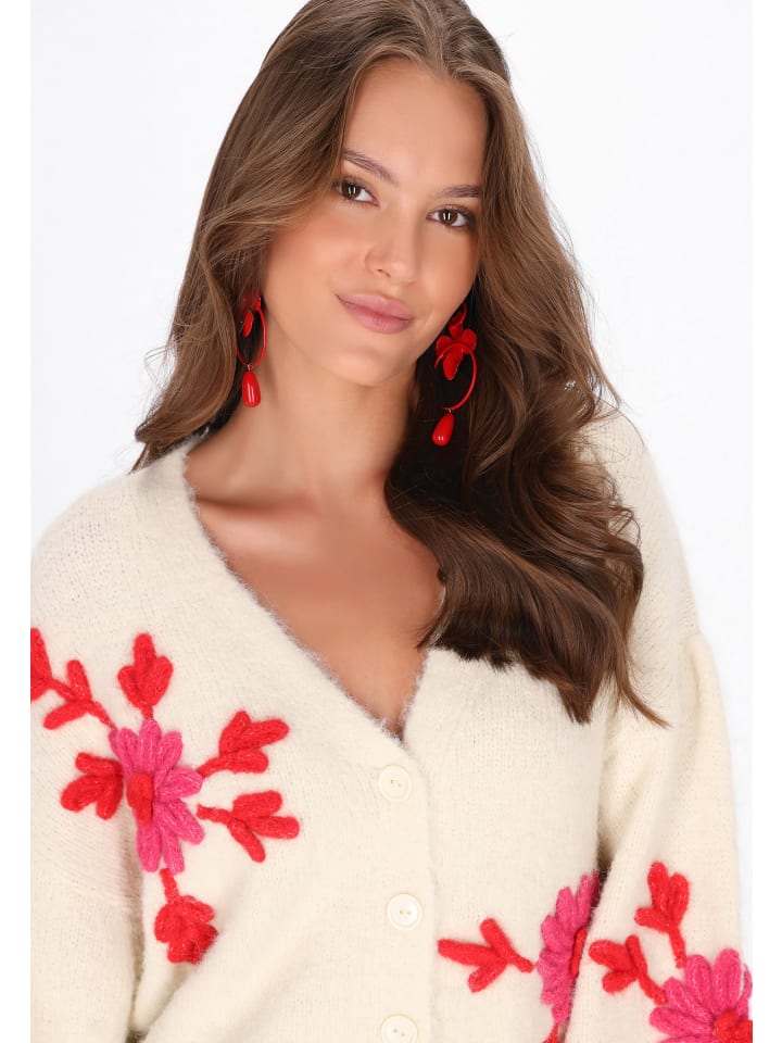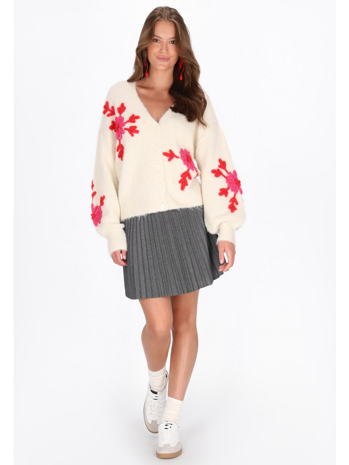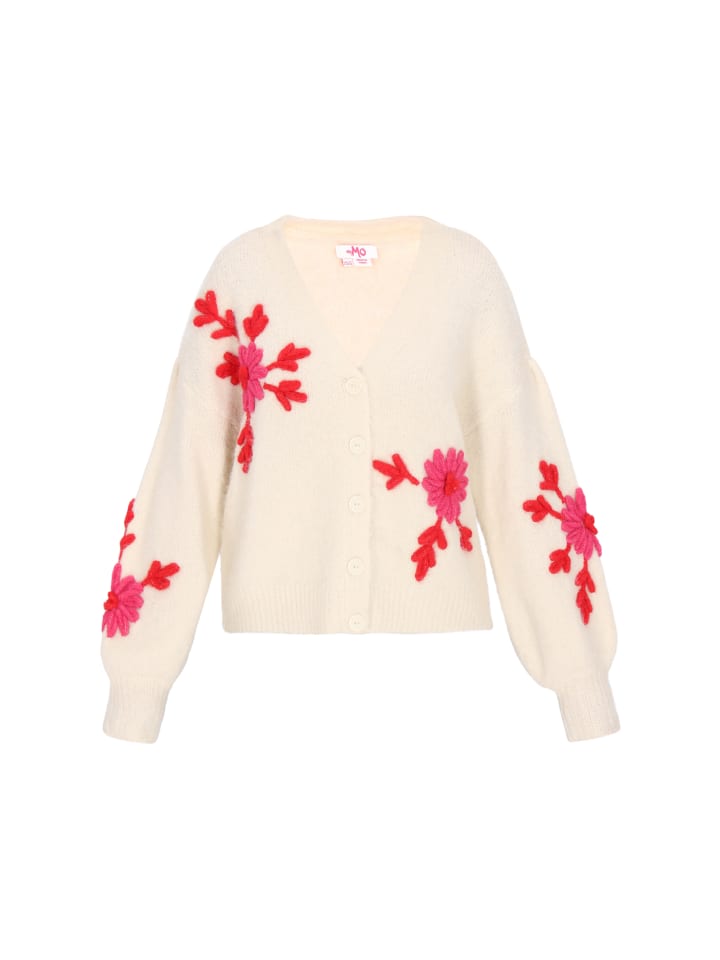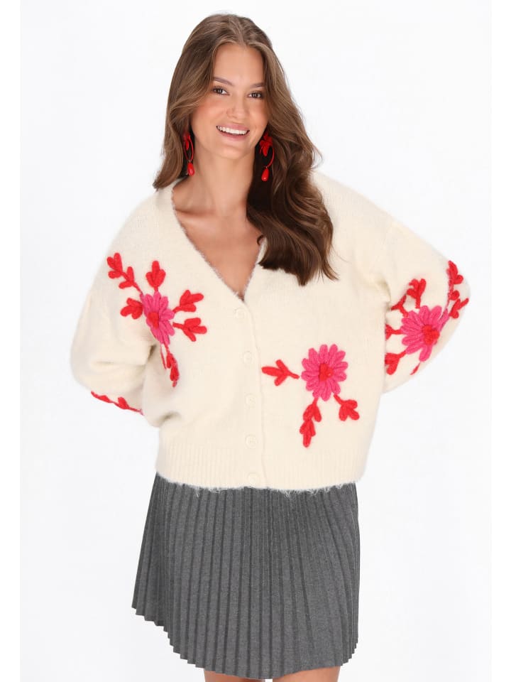 Легкий и женственный кардиган свободного кроя, сочетающий в себе комфорт и очарование. V-образный вырез и застежка на пуговицы делают его вневременным и простым в стилизации. Длинные рукава-фонарики и спущенные плечи добавляют непринужденный, модный штрих. Кардиган из мягкой трикотажной ткани отличается нежными вышитыми цветочными узорами, которые создают свежий и романтичный образ. Это идеальный повседневный выбор - непринужденный, уютный и стильный, он хорошо сочетается как с джинсами, так и с струящимися юбками. Созданный для молодых людей, которые ценят комфорт и очаровательные детали, он входит в коллекцию Young Fashion.