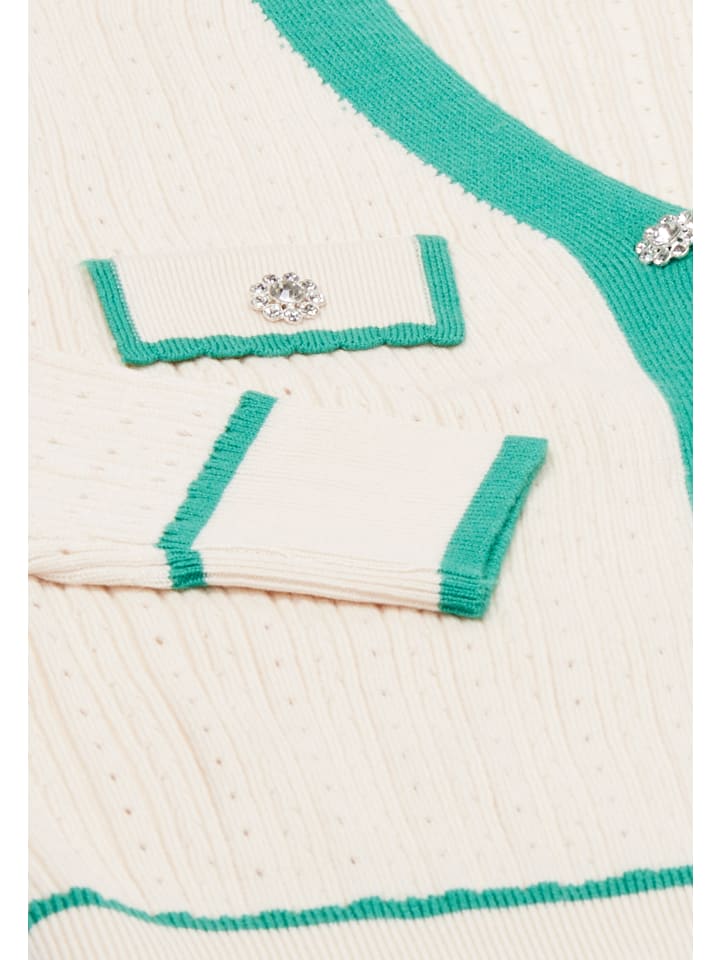 - вязаный кардиган, фактурный узор, V-образный вырез, контрастная отделка, украшенные пуговицы