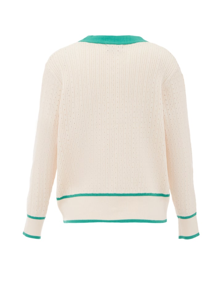 Представляем вязаный кардиган с фактурным узором, V-образным вырезом и контрастной отделкой по переду. Этот кардиган застегивается на пуговицы, украшенные пуговицами в один ряд, а также имеет два накладных кармана с соответствующей отделкой. Низ и манжеты рукавов также украшены контрастными деталями, сочетающими повседневные и элегантные элементы для создания классического преппи-стиля. Этот кардиган, разработанный совместно с NALLY, сочетает в себе вневременной стиль и современный дизайн.