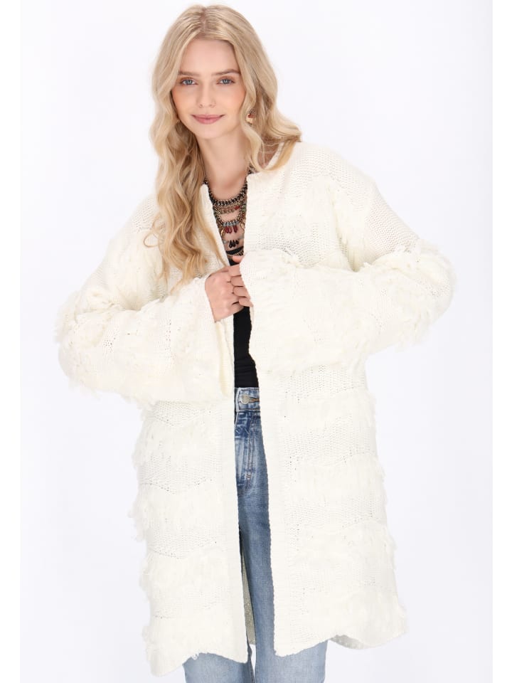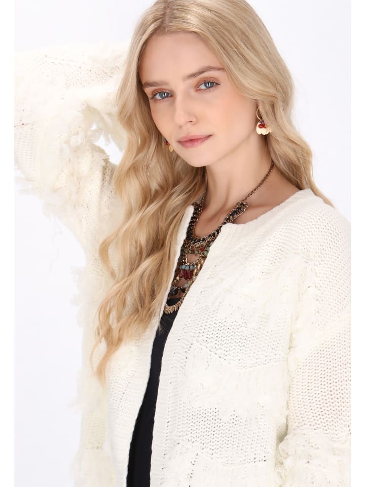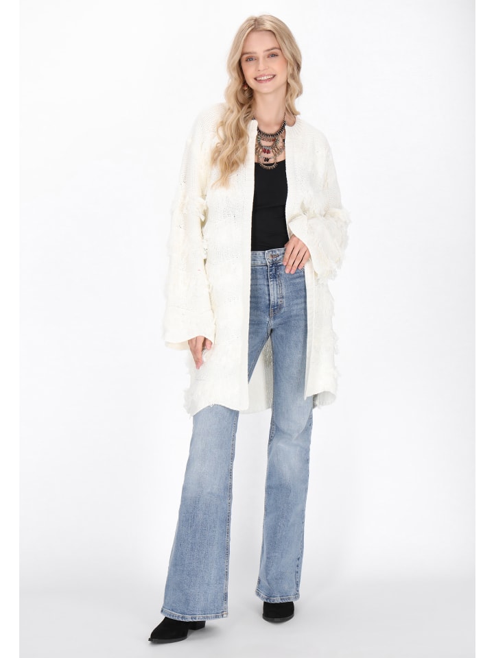 Стильный кардиган из коллекции Boho, созданный для комфорта и оригинального образа. Свободный крой со спущенной линией плеча и широкими рукавами гарантирует свободу движений и исключительный комфорт. Открытый перед и круглый вырез горловины придают изделию легкость, а трикотажная фактура с бахромой и выразительным фактурным узором привлекает взгляд и подчеркивает этнический колорит. Идеальный выбор для поклонниц стиля бохо, которые ищут оригинальные и удобные аксессуары для повседневного ношения.