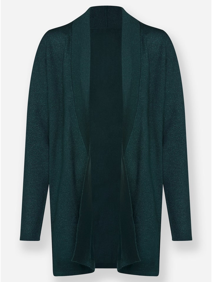 Длинный кардиган роскошного, сохраняющего форму качества из мерцающей пряжи. Отличается изящным воротником-стойкой и длинными рукавами. Открытый, подчеркивающий фигуру силуэт с высокими разрезами по бокам. Мягкая, эластичная ткань тщательно связана по фигуре. Изготовлен из вискозы ECOVERO производства Lenzing.