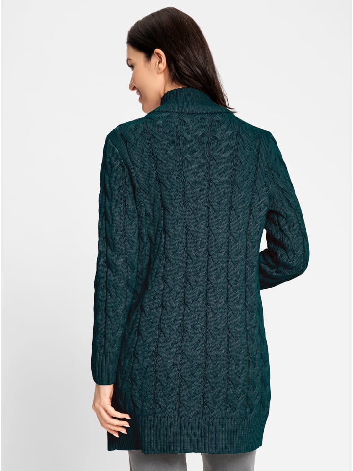 Чудесный теплый длинный кардиган с замысловатым узором «косички» по всей поверхности. Застежка на воротник-стойку и планку с пуговицами выполнена в тон. Накладные карманы с ребристыми прорезями. Длинные рукава с эластичными ребристыми манжетами и нижним краем. Изготовлен в соответствии с инициативой «Сделано в Африке» (Cat Made in Africa).