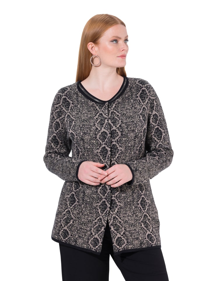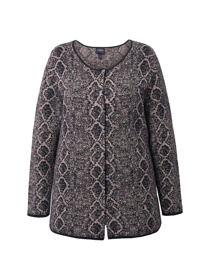 Кардиган классического кроя из мягкой тонкой вязки с жаккардовым узором «змея» и блестящим эффектом. Круглый вырез, потайная планка на пуговицах, длинные рукава. Гладкие края.