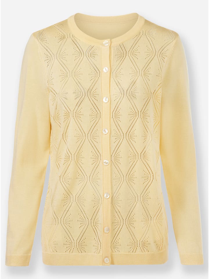 Изящный блеск: кардиган с изысканным ромбовидным и ажурным узором спереди. Невероятно мягкий и невероятно простой в уходе. Манжеты в рубчик с постоянно эластичной нитью. Тщательно связан для идеальной посадки.