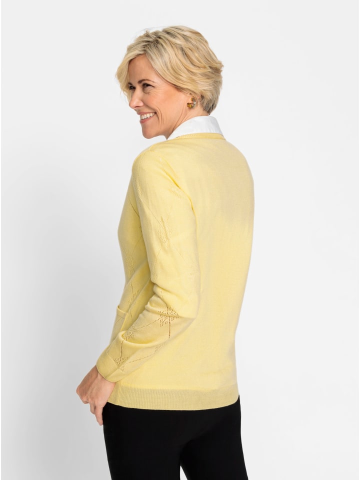 Передняя часть и рукава кардигана украшены изящным ромбовидным узором. Спинка связана гладкой вязкой. Передняя часть застегивается на пуговицы, V-образный вырез. Тщательно продуманный крой обеспечивает идеальную посадку. Два накладных кармана. Ребристые манжеты и низ.