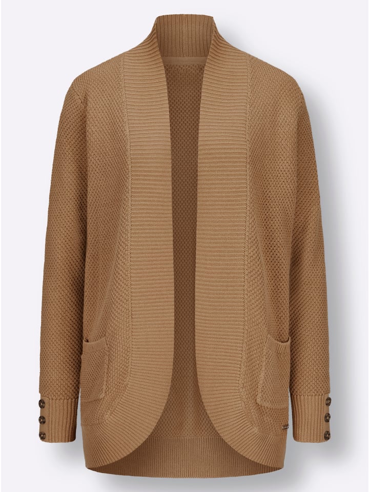 Укутайтесь стильно! Этот кардиган с открытым передом украшен эффектным фактурным узором. Сложная вязка, повторяющая форму изделия, дополнена красивыми деталями, такими как декоративные пуговицы на ребристых манжетах и закругленный ребристый подол спереди. Два накладных кармана. Изготовлен из хлопковой смеси. Поддерживает инициативу «Сделано в Африке» (Cat. Made in Africa).