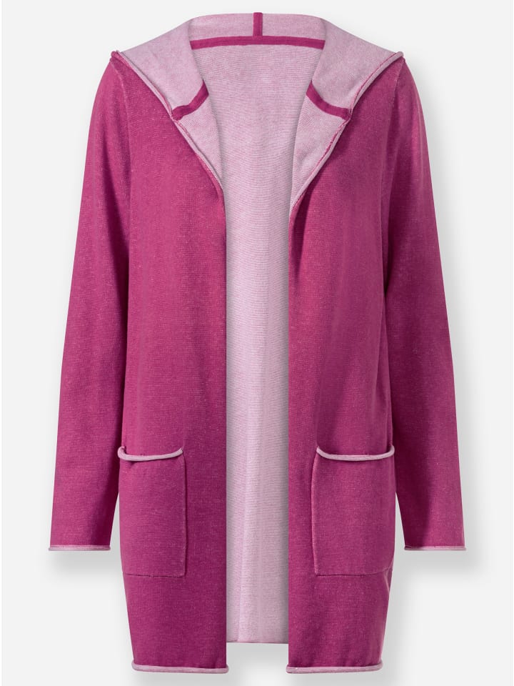 Длинный кардиган с эффектным сочетанием темной внешней и светлой внутренней сторон. Модный, но при этом подчеркивающий фигуру свободный крой с подвернутыми краями на манжетах. Капюшон, длинные рукава и два накладных кармана. Сложная вязка по фигуре. Изделие сертифицировано GOTS.