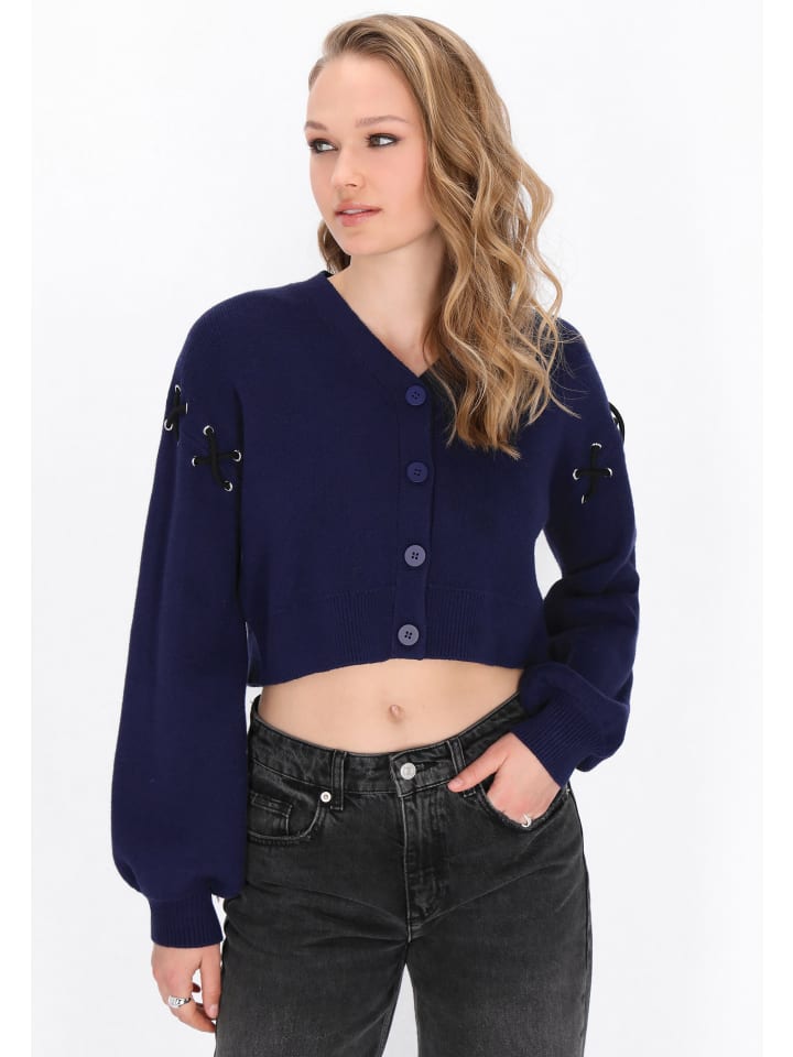 Откройте для себя модный укороченный кардиган из коллекции Mymo Rock. Свободный крой, округлый вырез и застежка на пуговицы спереди создают непринужденный образ. Длинные рукава-бишоп украшены декоративной шнуровкой, а трикотаж обеспечивает комфорт. Идеально сочетается с джинсами с высокой талией, создавая стильный и элегантный образ!