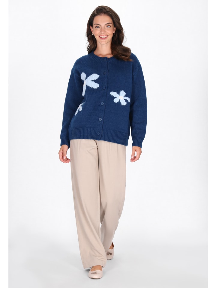 Этот кардиган из коллекции Fashion Look - стильный и удобный вариант на каждый день. Изготовленный из мягкого трикотажа с цветочным узором, он подкупает своим уютом и модным дизайном. Свободный крой со спущенной линией плеча и длинными рукавами гарантирует свободу движений и комфорт. Классический круглый вырез и застежка на пуговицы добавляют универсальности, делая его идеальным как для повседневных, так и для более женственных образов.