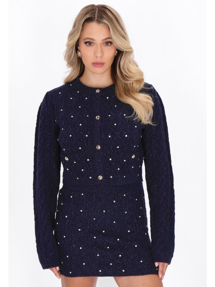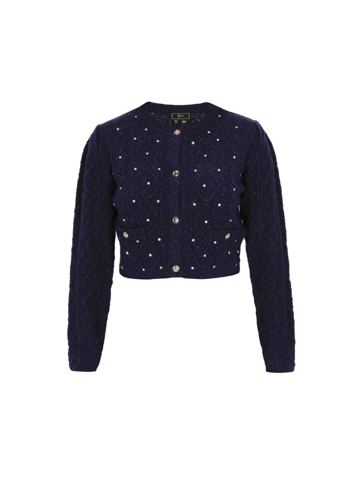 Этот укороченный вязаный кардиган прямого кроя - идеальное сочетание комфорта и женственного очарования. Выполненный в тканом узоре с блестящими нитями и изящными стразами, он привлекает внимание и добавит элегантности любому образу. Круглый вырез горловины, длинные, слегка присборенные рукава и практичные карманы подчеркивают его повседневный шик. Застежка на пуговицы позволяет легко адаптировать его к различным случаям - от повседневных до особенных. Теплый, эффектный и невероятно удобный - это must-have из нашей коллекции Fashion Look.