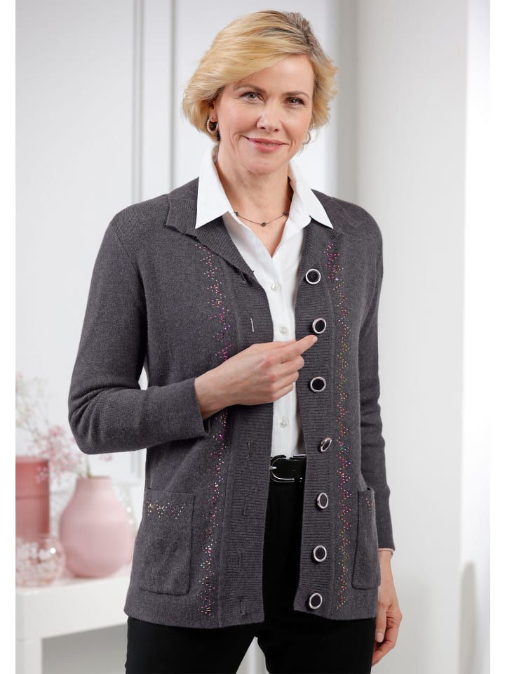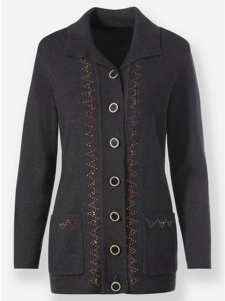 Этот мягкий и уютный кардиган может заменить даже пиджак и всегда выглядит великолепно! Он имеет большой отложной воротник, широкую ребристую переднюю часть с красивыми декоративными пуговицами и стразами, а также два накладных кармана со стразами. Ткань имеет легкий меланжевый эффект.