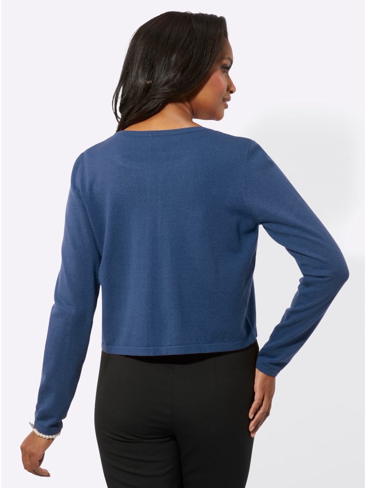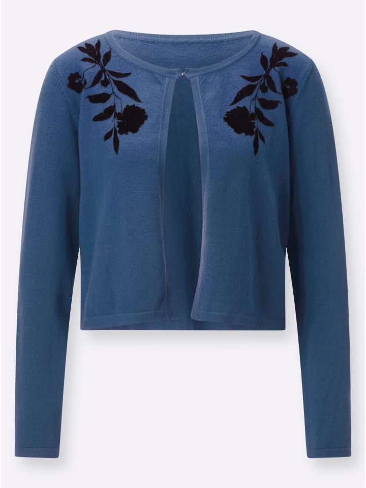 Идеально дополняет наряд: элегантный кардиган в стиле болеро с практичной застежкой на крючок на круглом вырезе. Красивый бархатный принт, начинающийся от плеча. Мягкая, тонкая вязка. Вискоза качества ECOVERO от Lenzing.