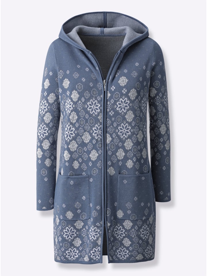 Пусть этот длинный кардиган с жаккардовым узором со снежинками перенесет вас в зимнюю сказку! Он имеет капюшон, молнию и два накладных кармана с узором. Изготовлен из мягкой, но сохраняющей форму ткани. Соответствует инициативе «Сделано в Африке» (Colloton Made in Africa).