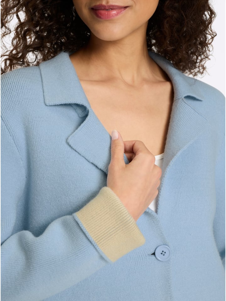 Трикотажная куртка из тонкой резинки в двухцветном исполнении. Отличается отложным воротником, застежкой на одну пуговицу, длинными рукавами и карманами. Изготовлена из вискозы Lenzing ECOVERO.