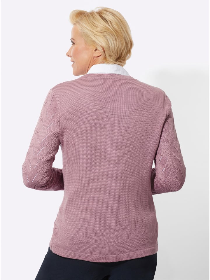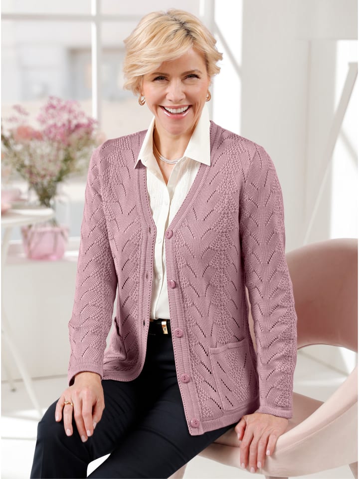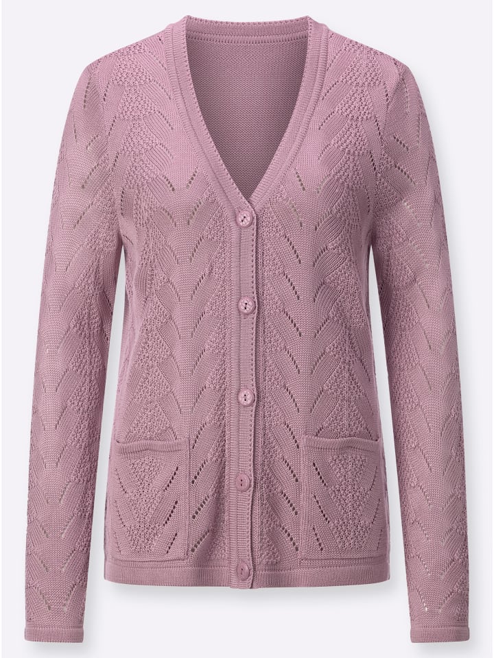 Для уюта и комфорта: мягкий кардиган с замысловатым ажурным узором спереди и на рукавах. V-образный вырез, декоративные пуговицы, 2 практичных накладных кармана.