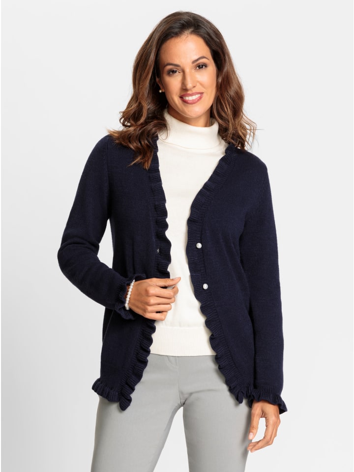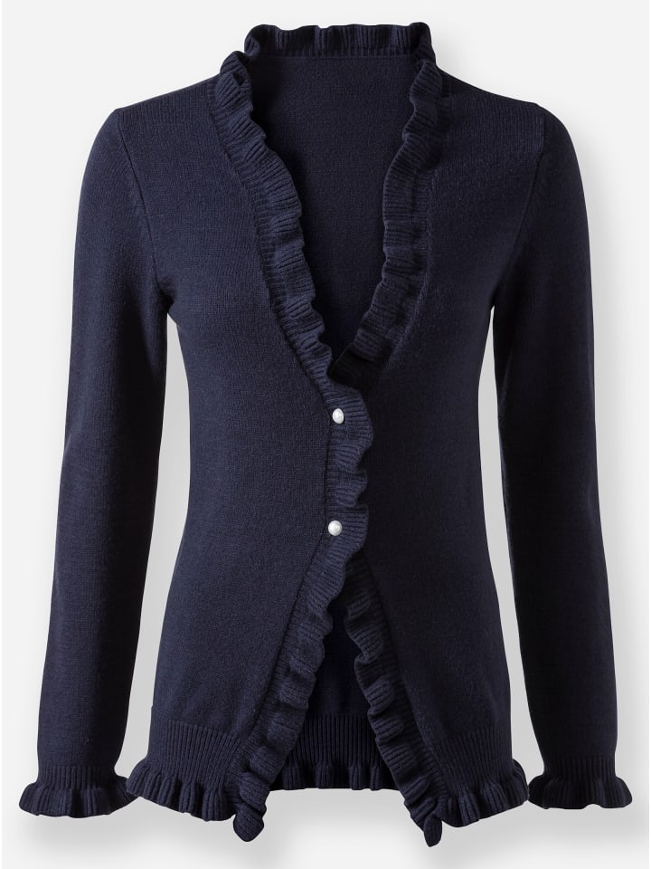 Шик в трикотаже: этот кардиган украсит любой образ женственными деталями. Оборки вдоль V-образного выреза, на манжетах и на планке с двумя пуговицами из высококачественного жемчужного принта. Тщательно связан по форме. Ребристая резинка по низу.