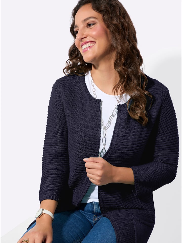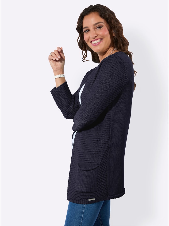 Непринужденный кардиган без рукавов с привлекательным рисунком спереди и на рукавах. Два накладных кармана. Слегка удлиненный крой выгодно подчеркивает фигуру. В поддержку инициативы «Хлопок, сделанный в Африке».