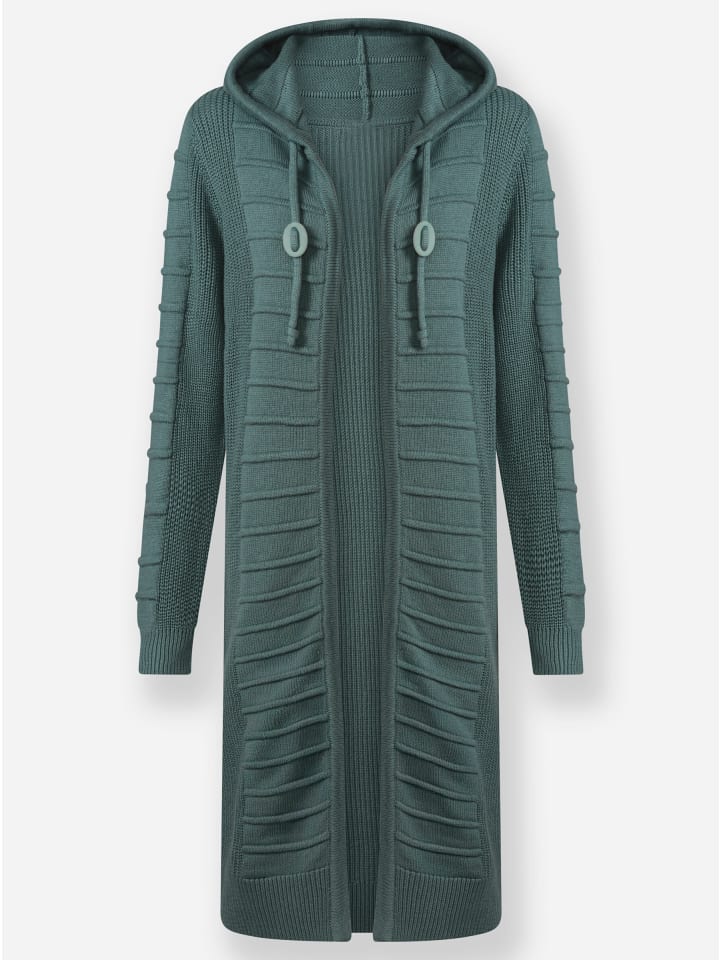 Очень длинный и суперсовременный: длинный кардиган изысканного кроя с капюшоном, затягивающимся шнурком и фиксирующими шнурками. Открытый крой и продуманное сочетание трикотажных узоров подчеркивают фигуру. Длинные рукава и подол отделаны ребристыми манжетами и кромкой. Поддерживает инициативу «Сделано в Африке» (Cat Made in Africa).