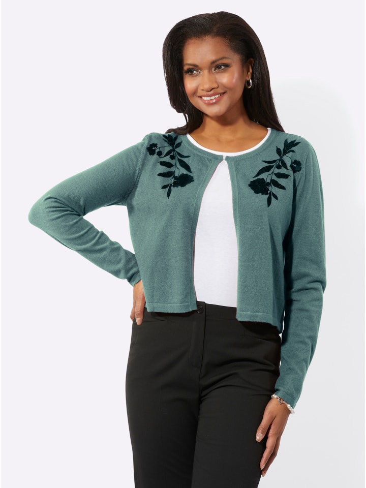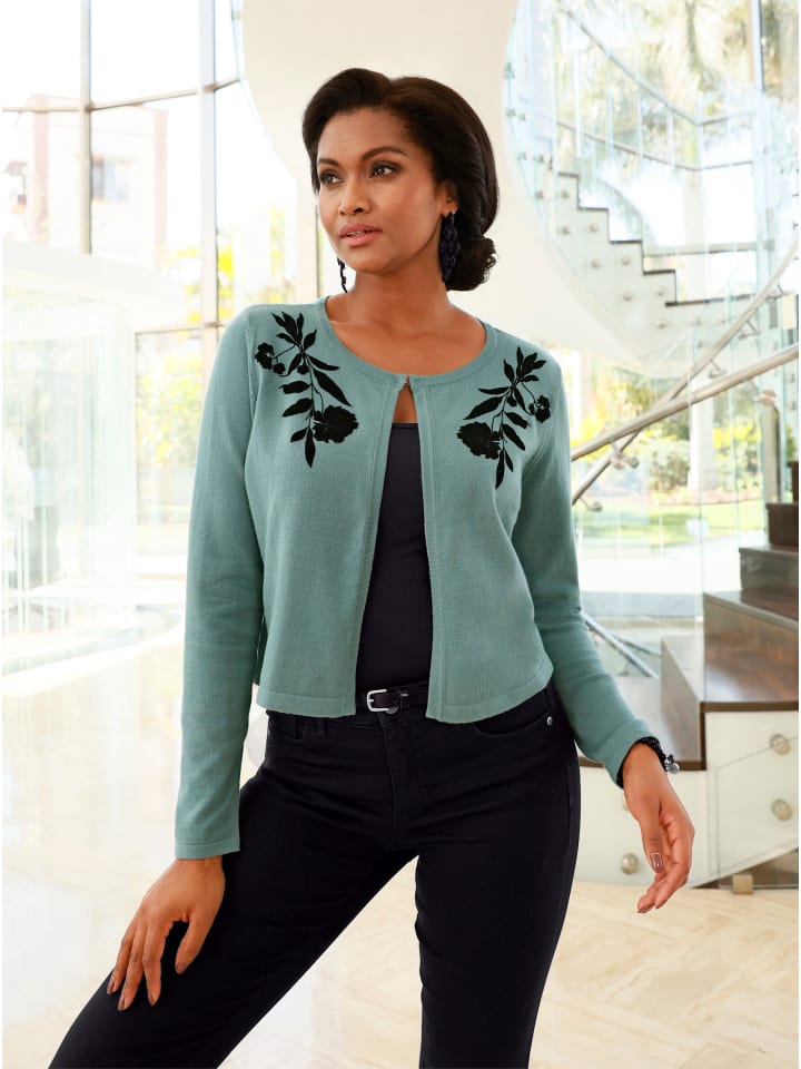 Идеально дополняет наряд: элегантный кардиган в стиле болеро с практичной застежкой на крючок на круглом вырезе. Красивый бархатный принт, начинающийся от плеча. Мягкая, тонкая вязка. Вискоза качества ECOVERO от Lenzing.