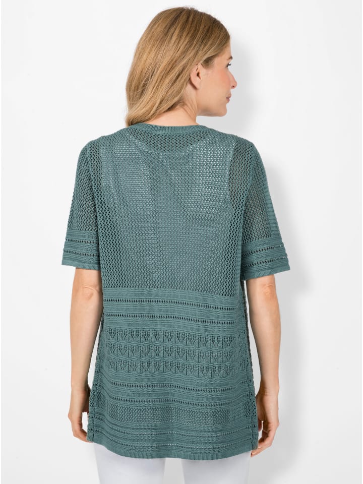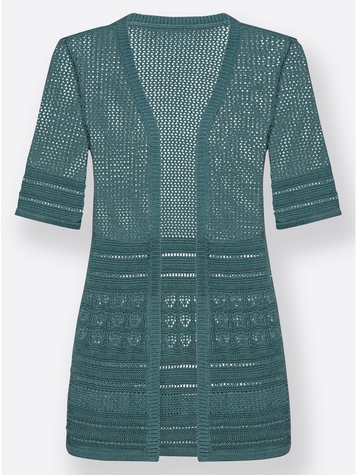 Наш незаменимый предмет одежды на лето: кардиган, связанный из смеси различных воздушных ажурных узоров. Благодаря слегка удлиненному ажурному крою он прекрасно подчеркивает фигуру и является универсальным предметом гардероба. Рукава немного удлиненные до середины бедра.