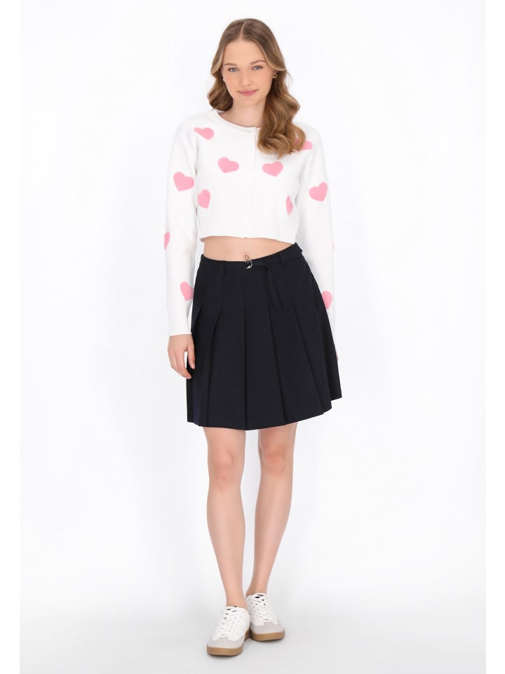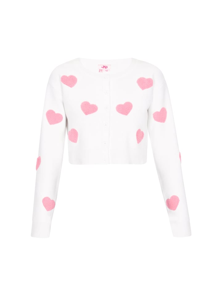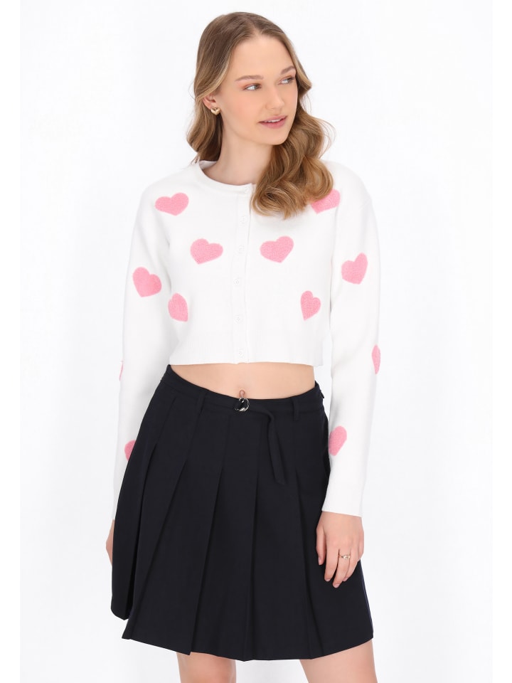 Этот короткий кардиган - идеальное сочетание девичьего очарования и повседневного комфорта. Он изготовлен из мягкого трикотажа и впечатляет романтичным узором в виде сердечек и декоративными пуговицами, которые добавляют ему неповторимый штрих. Классический крой, круглый вырез горловины и длинные рукава делают его идеальным как для повседневных, так и для более стильных образов. Незаменимая вещь