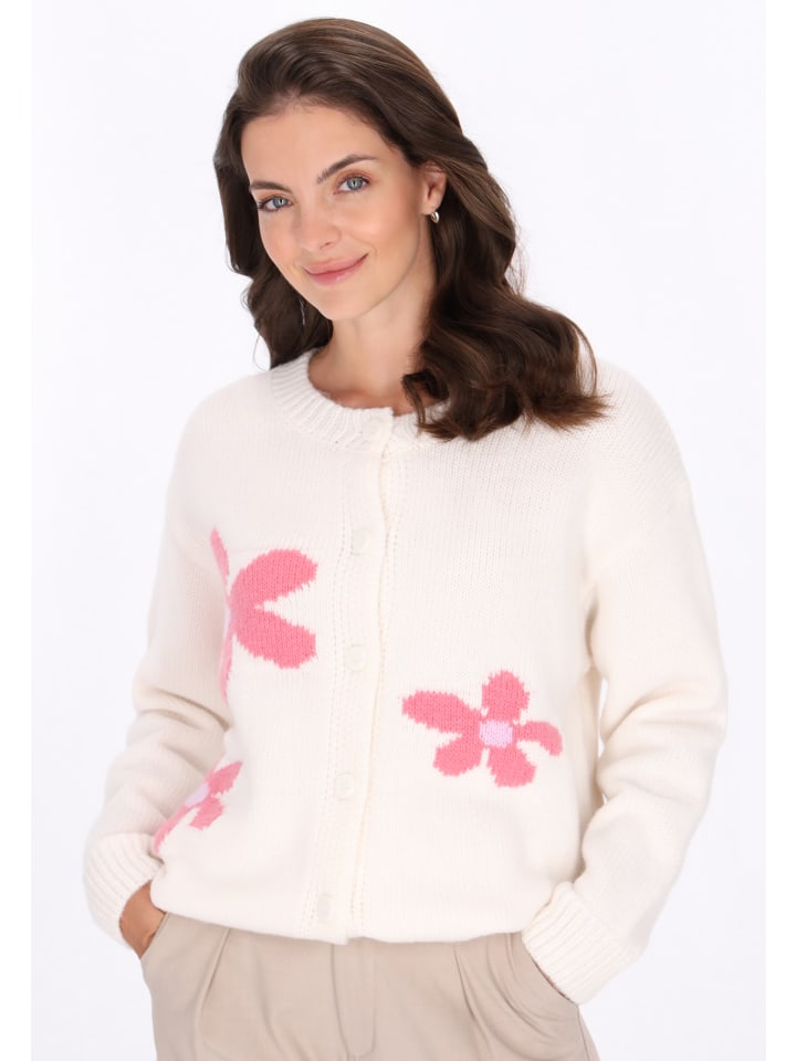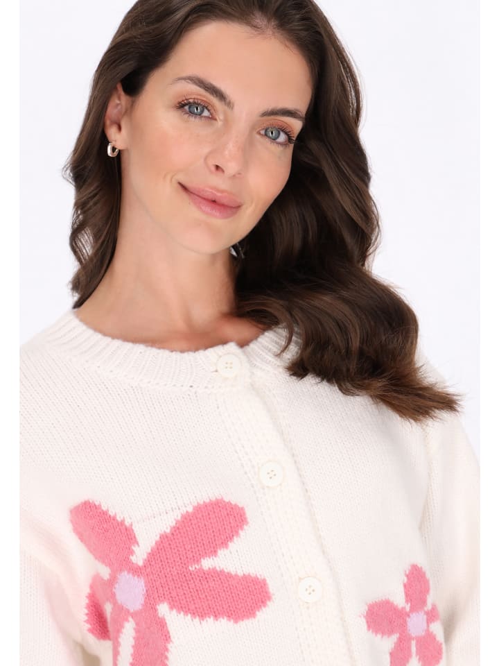 Этот кардиган из коллекции Fashion Look - стильный и удобный вариант на каждый день. Изготовленный из мягкого трикотажа с цветочным узором, он подкупает своим уютом и модным дизайном. Свободный крой со спущенной линией плеча и длинными рукавами гарантирует свободу движений и комфорт. Классический круглый вырез и застежка на пуговицы добавляют универсальности, делая его идеальным как для повседневных, так и для более женственных образов.