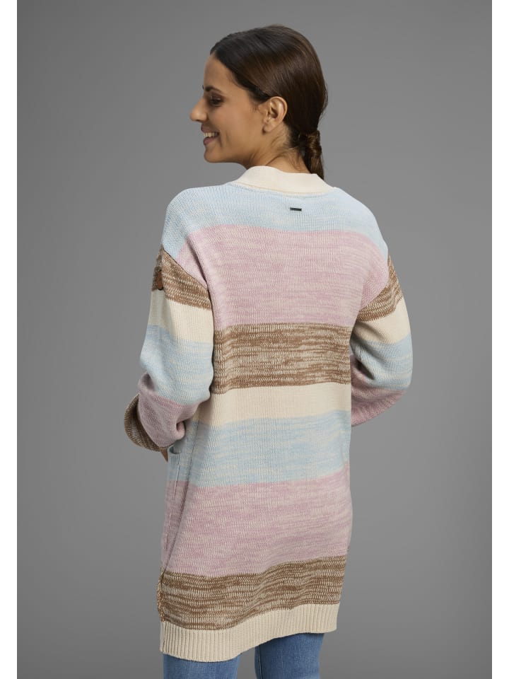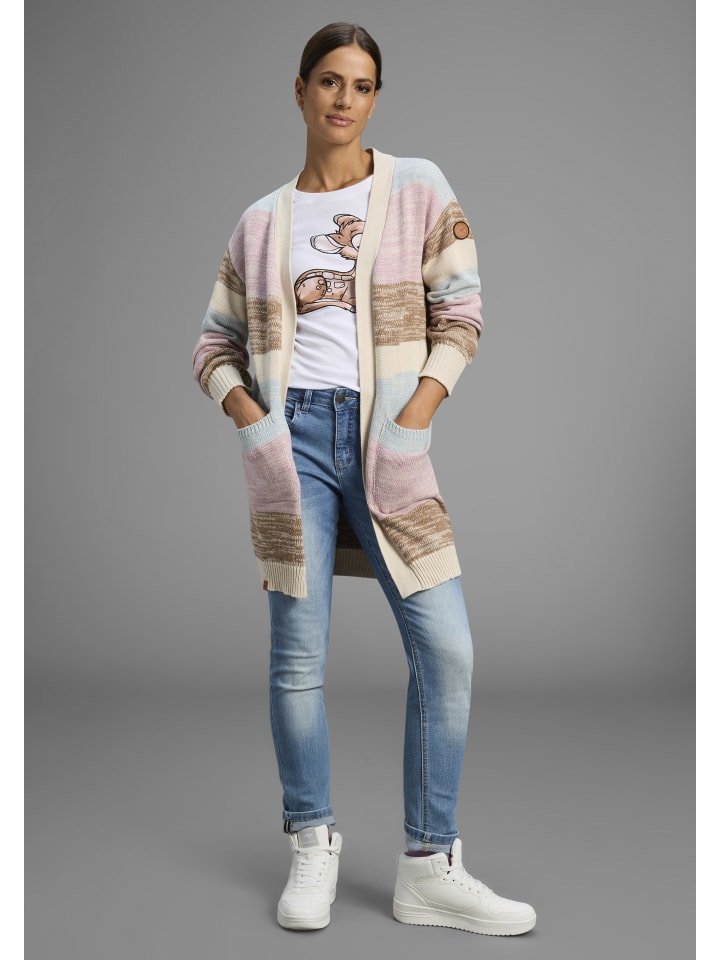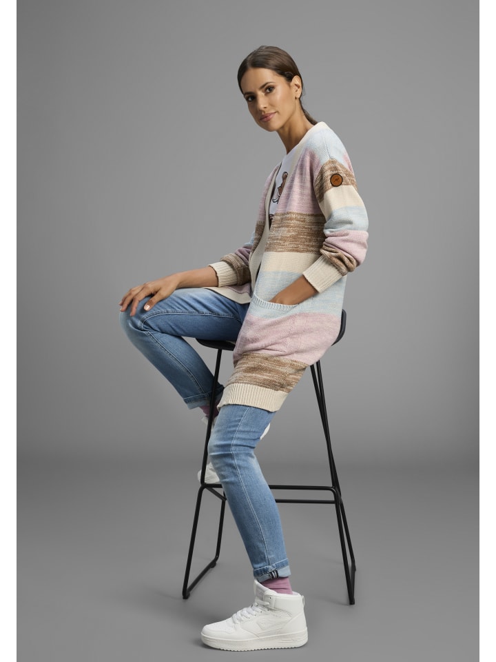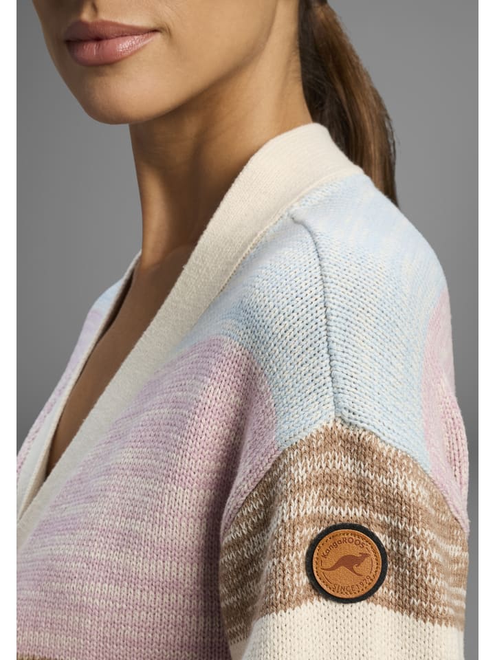 Вы можете положиться на этот женский кардиган KangaROOS даже в холодную погоду. Кардиган имеет глубокий V-образный вырез и доходит до бедер. Длинные рукава и подол отделаны резинкой. Ценные вещи можно безопасно хранить в карманах. Значок дополняет образ. Этот кардиган невероятно удобен и отлично защищает от холода. Будь то для кофе с друзьями или для работы в офисе, он универсален и уютен.