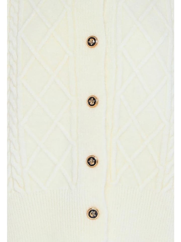 Этот вязаный кардиган украшен очаровательным фактурным узором, сочетающим ромбы и вертикальную резинку. Круглый вырез горловины, передняя часть застегивается на декоративные пуговицы, длинные рукава с ребристыми манжетами и ребристый подол - этот кардиган идеально подходит для использования в качестве внешнего слоя, обеспечивая одновременно тепло и стиль. Эффектные пуговицы добавляют очарования этому уютному изделию. Разработанный совместно с aleva, этот кардиган сочетает в себе классический стиль и современный дизайн.